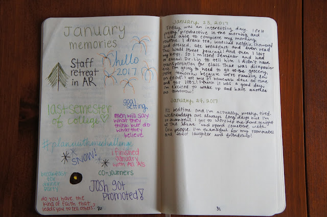 I think it will be fun to make a memories page each month! We had a great first month of 2017, Josh got promoted to full time at his job, and we spent time with the staff from our church in Arkansas. It has been so fun getting to know the other staff member’s families and making more connections so that we can really feel like Pittsburg is home. January also marked the beginning of my last semester of college and I’m happy I was able to end the month with all A’s! I also started my first bullet journal and participated in the #planwithmechallenge on Instagram.