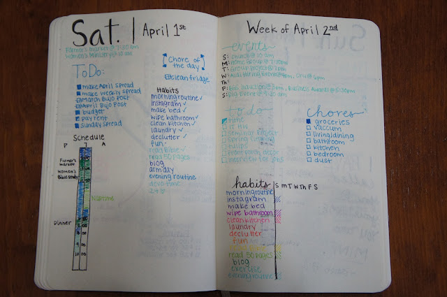 And here’s where the changes begin. I wasn’t sure how I wanted to approach April 1st because it was a Saturday and I didn’t want to make a whole weekly spread for one day but it also bugged me to include it in the next week. So I decided to use daily and weekly spreads for the month of April!