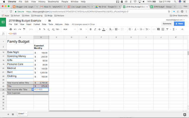 13. The next formula simply subtracts the tithe line from the income before tithe line. You subtract by typing the formula =B24-B25