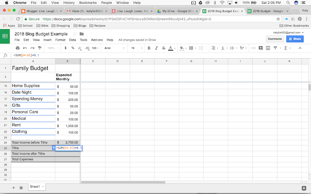 12. Next I use the formula =SUM(B4:B5)*.10 in the tithe category to show that we are taking 10 percent out of our income to give to the church.
