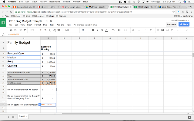 17. Next Josh and I always add a line that subtracts budgeted income from actual income. We use this line to tell us if we made more than we thought and then we use that amount to make a contribution to some of our goals. In this example we’ll use the extra money to go towards an emergency fund, which is the first step of Dave Ramsey’s 7 Baby Steps for Getting out of Debt . The formula used here is =B24-$B$24 Use the dollar sign to make that second cell permanent so that when we copy this formula into the monthly totals, it will stay the same for each cell. If you don’t, it will make the formulas inaccurate in later steps.