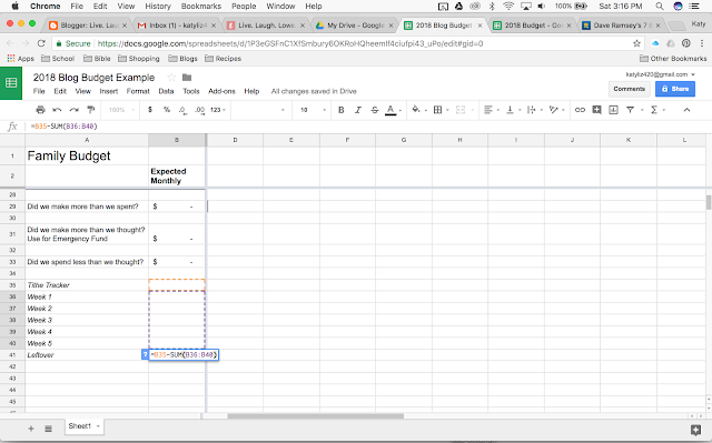19. 2 more steps for this part! After this I add a tithe tracker so that we make sure we give what we’re committed to giving and this year we’re going to try our best to keep up with it each week. It’s not too difficult to make. I label the start of it Tithe Tracker and the cell to the right has a formula that links this cell and the tithe cell.