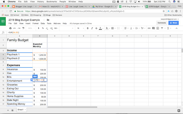 11. In the last part we set up our budget amounts. So each month, before we can spend, we take out a percentage of our money and give it to our local church. In our budget we have two income spots, income before tithe and income after tithe. Income after tithe is what we will use to cover our expenses each month. If you don’t go to church you can skip the tithe line. After putting in budget amounts I add formulas to total up the income and expenses. In the Before Tithe section I use the formula: =SUM() And in the parentheses I highlight the cells for income. In this example the formula looks like =SUM(B4:B5)