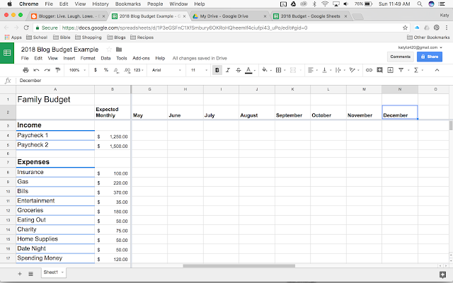 And that’s the whole spreadsheet! I hope the pictures helped further explain the steps. I don’t think it’s too hard to make once you get started. Each month, Josh and I used our tracked expenses on Mint to fill in the income and expenses for that month. Then we make sure that we didn’t spend more than we made, that we use any money we made more than we thought to make a contribution to our goals, and we check to see if we spend less than we thought. The spreadsheet helps us look at what Mint tracks for us. I’ll do another blog soon to show our monthly process. Please comment or send me an email or direct message if you have any questions, I’m happy to help!